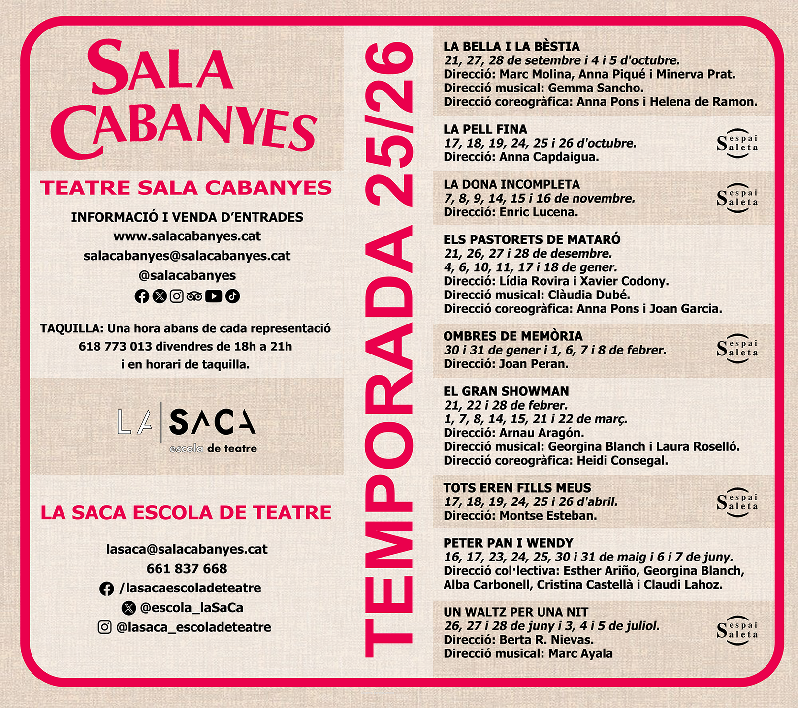 Algunes dates poden canviar. Consulteu la cartellera i la pàgina web de cada obra.No s'admeten canvis ni devolucions